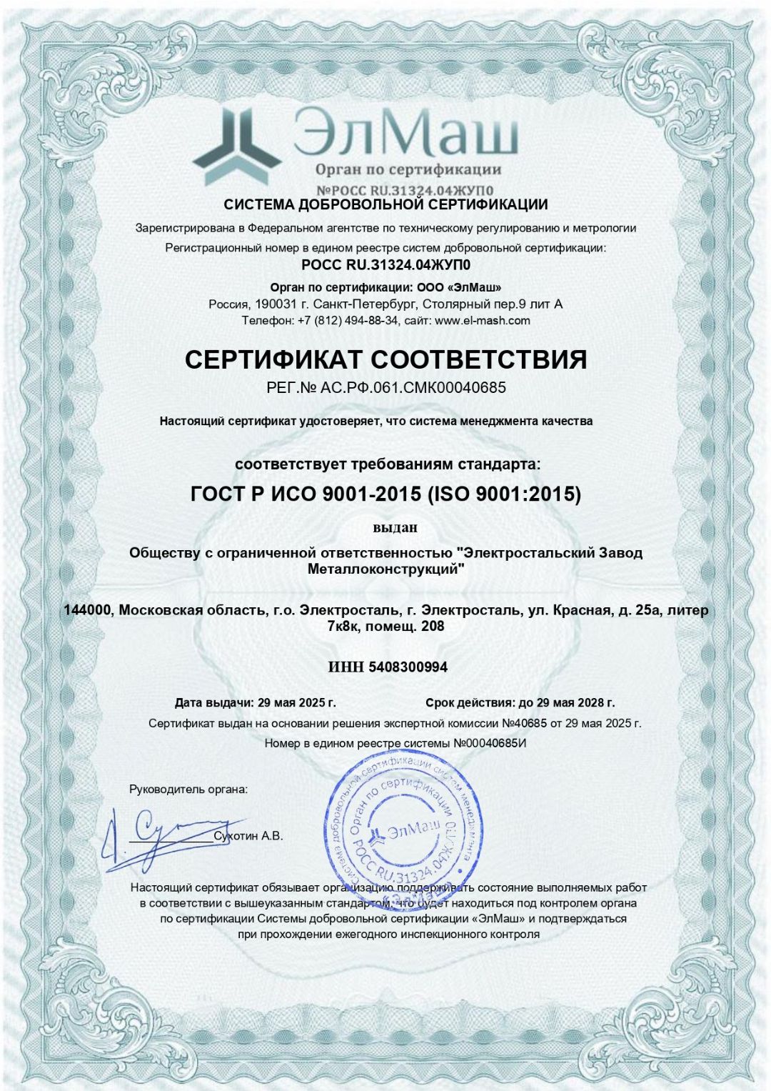 Сертификат соответствия ГОСТ Р ИСО 9001-2015 (ISO 9001:2015)